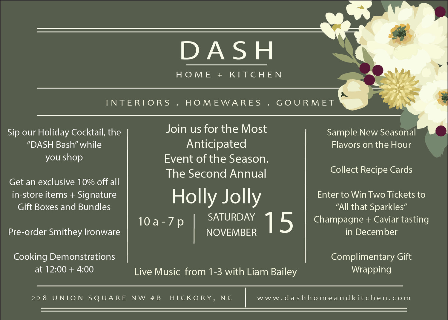 Go ahead and mark your calendars for this one! The holiday season is in the air, and you are invited to our Second Annual Holly Jolly Jubilee to ring in the season! Get an exclusive 10% off all in-store items and our signature holiday gift boxes. Sample new holiday flavors along with our everyday staples on the hour. Collect holiday recipe cards highlighting some of our favorite products. Cooking and baking demonstrations are scheduled at 12:00 noon and 4:00 pm. You will be treated to our signature cocktail the “DASH Bash” while you shop. Enter to win two tickets to the “All that Sparkles” champagne and bubbly class in December. Complimentary holiday gift wrapping available. Live music. See you there!