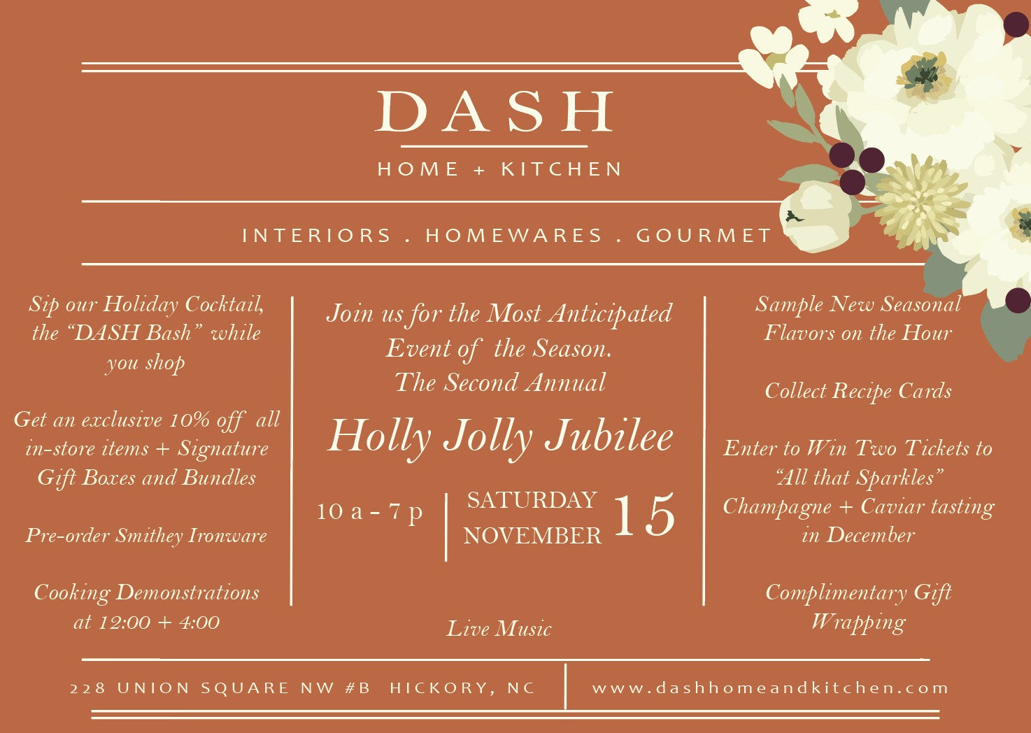 Annual Holly Jolly Jubilee to ring in the season! Get an exclusive 10% off all in-store items and our signature holiday gift boxes. Sample new holiday flavors along with our everyday staples on the hour. Collect holiday recipe cards highlighting some of our favorite products. Cooking and baking demonstrations are scheduled at 12:00 noon and 4:00 pm. You will be treated to our signature cocktail the “DASH Bash” while you shop. Enter to win two tickets to the “All that Sparkles” champagne and bubbly class in December. Complimentary holiday gift wrapping available. Live music. See you there!