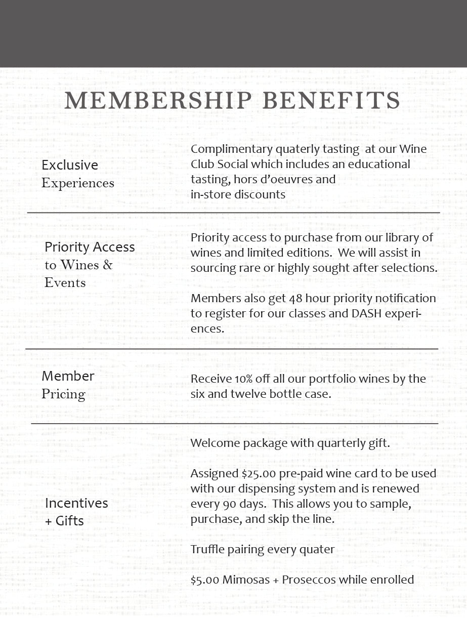 Membership with the DASH Reserved Wine Club comes with more than just wine — it offers a community and an experience. As a member, you’ll enjoy exclusive pricing on additional bottles, along with priority access to all DASH events. Invitations to private tastings and intimate wine dinners at DASH create opportunities to connect and learn, while the expertly curated selections each season are crafted to surprise and delight. Beyond the bottles, you’ll join a warm and welcoming community of wine enthusiasts who share your passion.