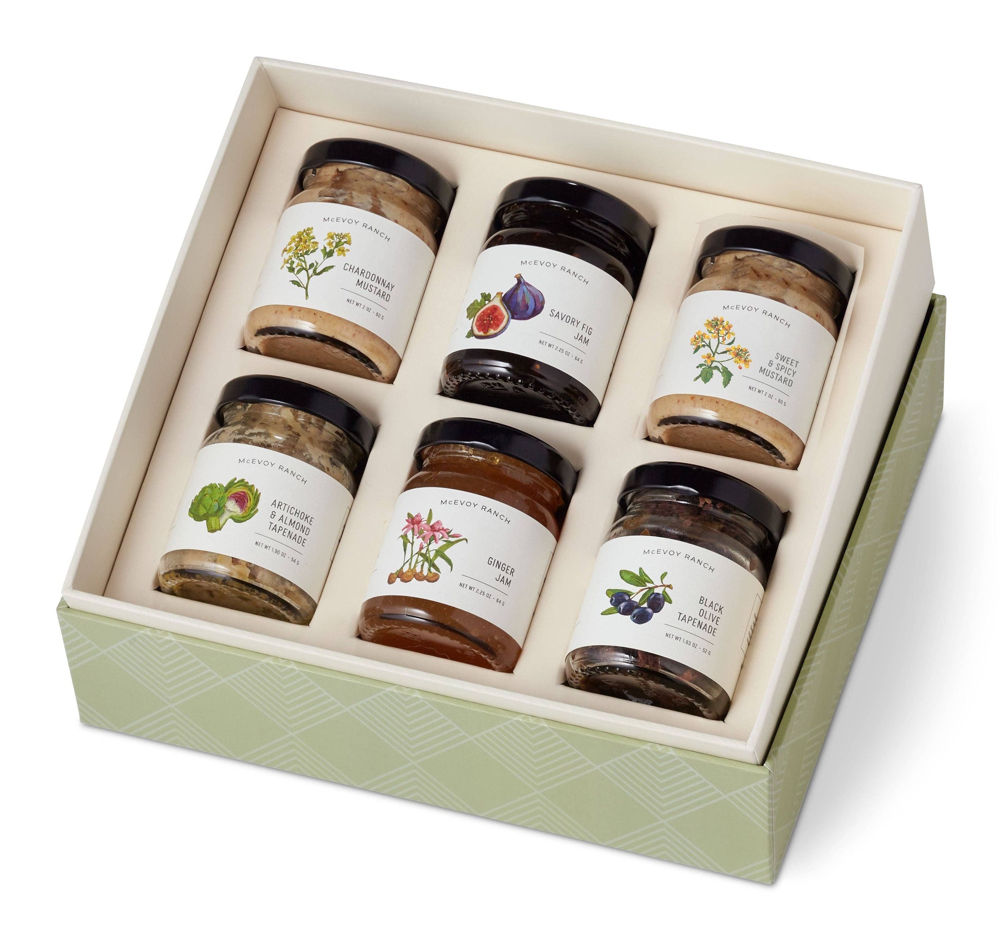 This Gift Pack includes mini jars of the following: * Savory Fig Jam 2.25oz * Ginger Jam 2.25oz * Chardonnay Mustard 2oz * Artichoke Tapenade 1.9oz * Black Olive Tapenade 1.83oz * Sweet & Spicy Mustard 2oz.