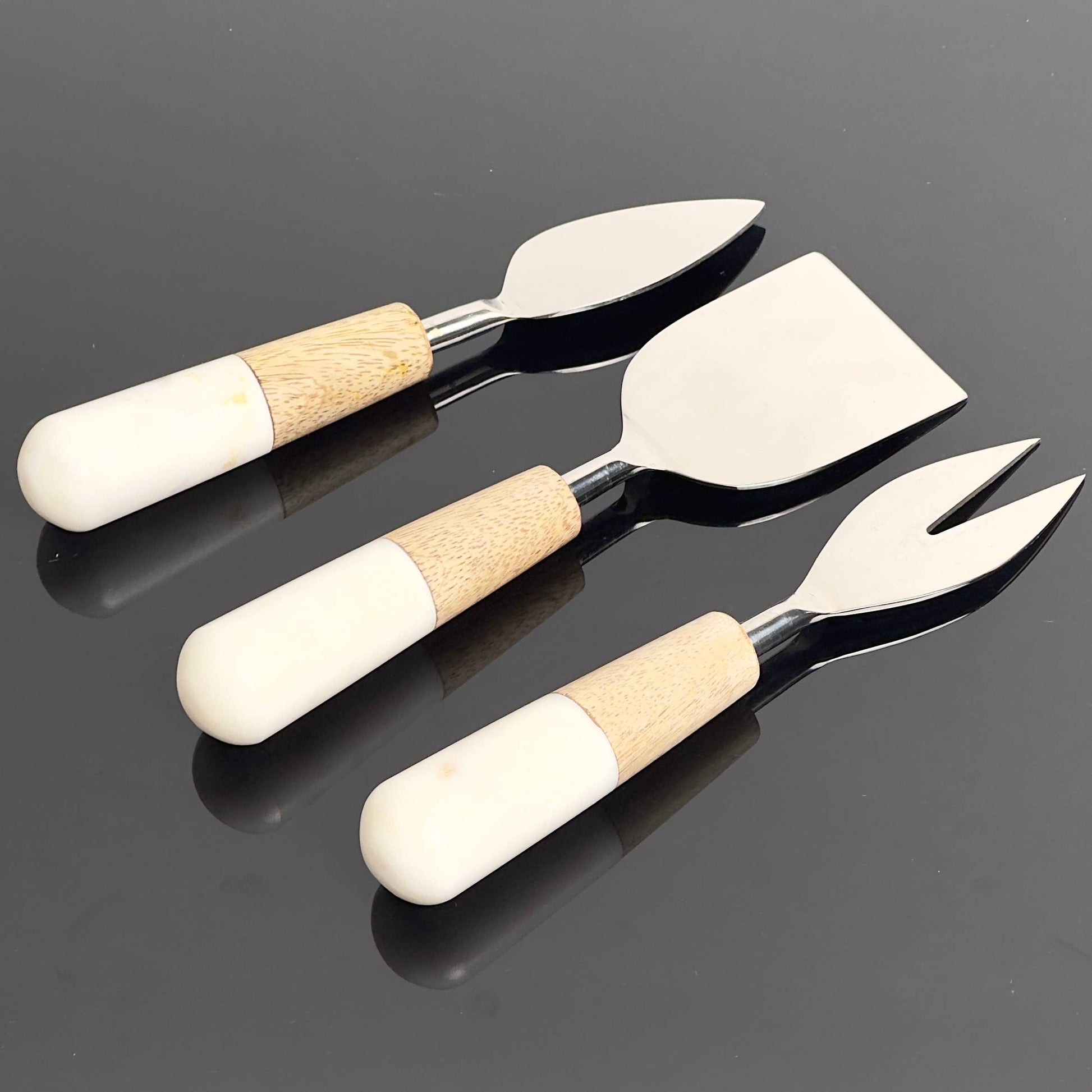 7" | The Marble & Wood Handle Cheese Set is a must-have for any cheese lover. This set includes three essential tools for serving and enjoying cheese. Crafted from high-quality materials, these tools are not only durable but also stylish, making them a perfect addition to your home. The set includes a cheese knife, cheese slicer, and cheese fork, providing you with everything you need to cut, slice, and serve your favorite cheeses. Whether you're hosting a dinner party or simply enjoying a cheese platter at home, this Marble & Wood Handle Cheese Set is the perfect companion. Elevate your cheese experience with this elegant and functional set.