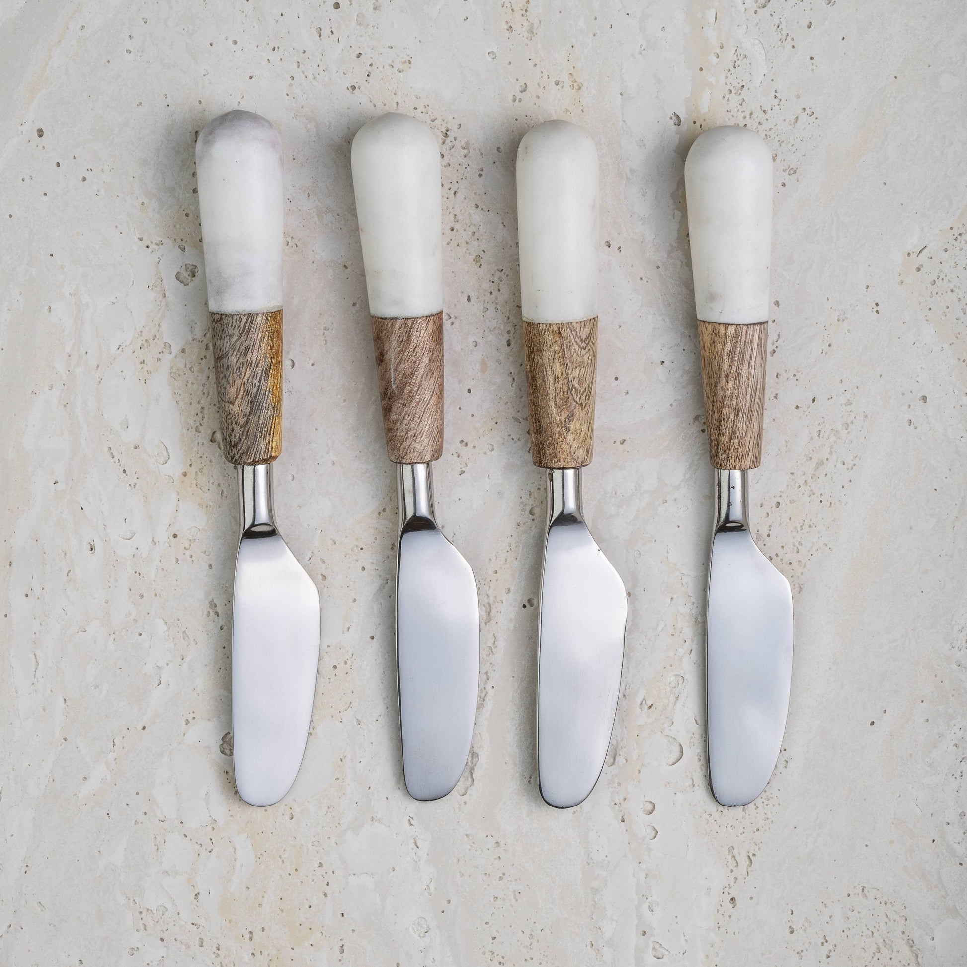 Introducing our Wood and White Marble Spreaders, the perfect addition to your home serverware collection. Crafted with a combination of stainless steel, wood, and stone, these spreaders offer a unique and elegant touch to any dining experience. The smooth white marble handles provide a comfortable grip, while the wooden accents add warmth and natural beauty. Whether you're hosting a dinner party or enjoying a casual meal, these spreaders are ideal for spreading butter, cheese, or any other delectable spread. With a set of four, you'll have plenty to share with family and friends. Elevate your serving style with our Wood and White Marble Spreaders.
