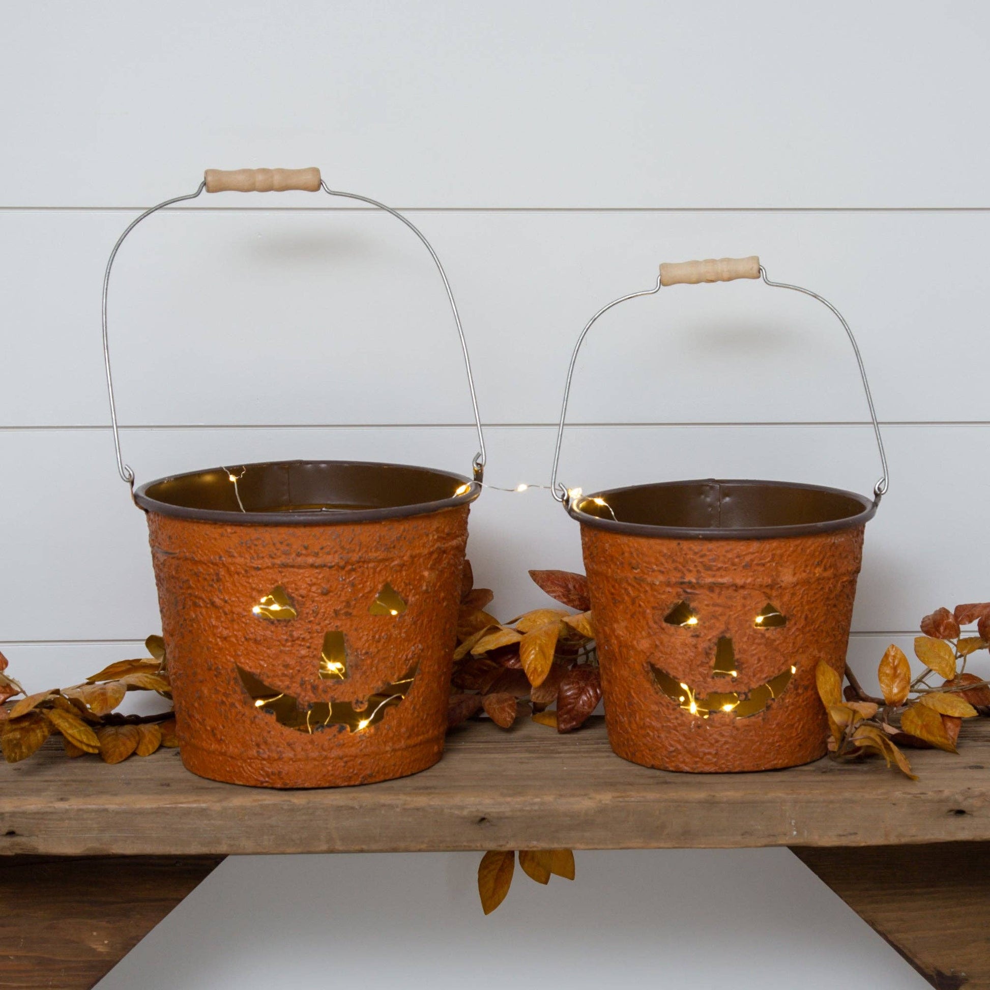 Rustic metal painted jack-o-lantern treat baskets. Sold in two sizes: